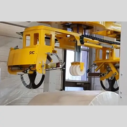 OMC-R reel wrapping machines can wrap various reels of paper, steel, aluminum, or composite. The machine can be equipped with a rotary arm for axial wrapping or with a linearly moving head for radial wrapping.